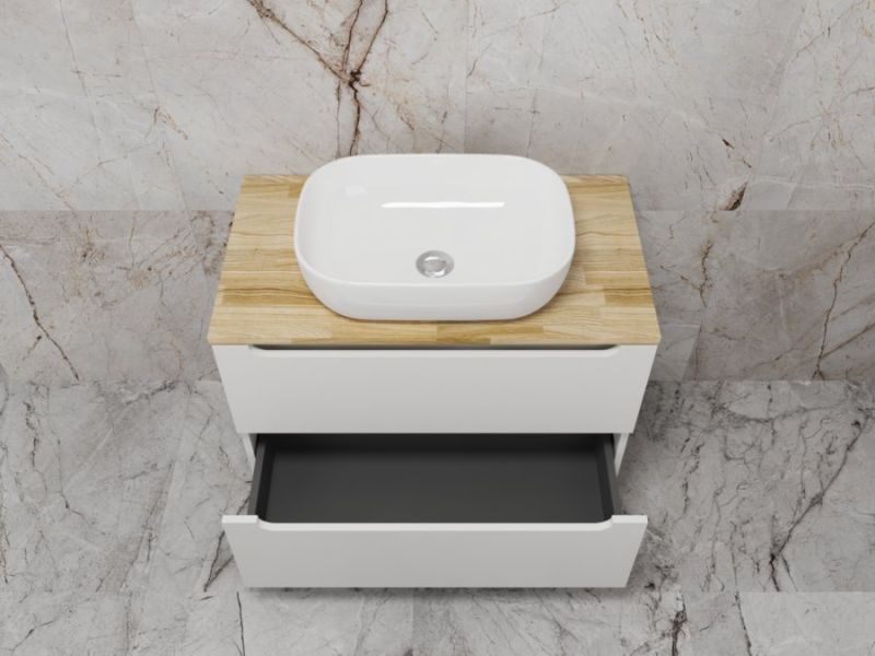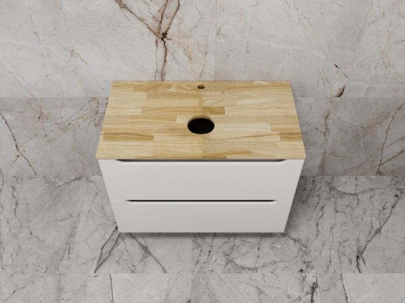 Столешница из натурального ясеня толщиной 20 мм покрыта матовым влагостойким лаком. Фасады и корпус в матовой пленке SOFT TUOCH. Внутренне наполнение из ЛДСП в декоре ГРАФИТ с эргономичным ограничителем под сифон. Фасады без ручек с лаконичным вырезом для комфортного открывания. Выдвижные ящики с системой плавного закрывания SOFT CLOSE. Экологичные и влагостойкие материалы. Легкость в уходе, практичность и стильный внешний вид.