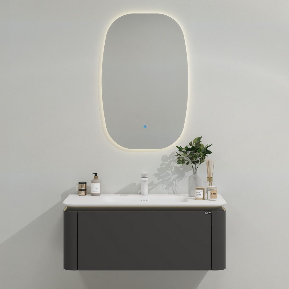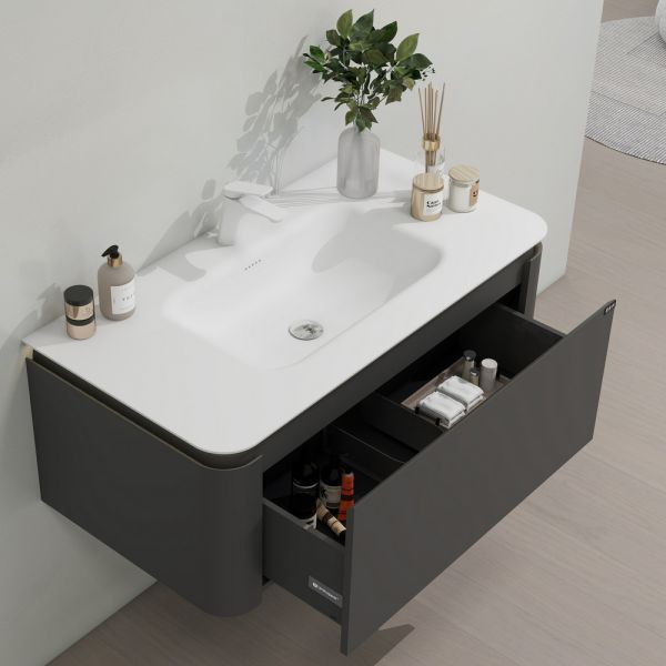 Тумба с раковиной для ванной комнаты датского производителя Black&White в габаритных размерах 100x52x40 см.Данная версия является продолжением линейки U 925 в сером цвете. Раковина — столешница изготовлена из не пористого искусственного камня Corian, который тактильно ощущается как soft touch материал, он легок и прост в уборке,а слив оборудован донным клапаном хромированного цвета. База производится из влагостойкой девятислойной фанеры и покрыта эмалью для долгосрочного сохранения материала.Важной особенностью является контурная диодная подсветка, которая расположена по периметру столешницы.На тумбе предусмотрен один выдвижной ящик, оборудованный фурнитурой UniHopper с доводчиками.Коллекция U 935– эргономичный и продуманный продукт,который наполнит Вашу ванную комнату уютом, а плавные и утонченные формы впишутся в любые современные интерьеры.