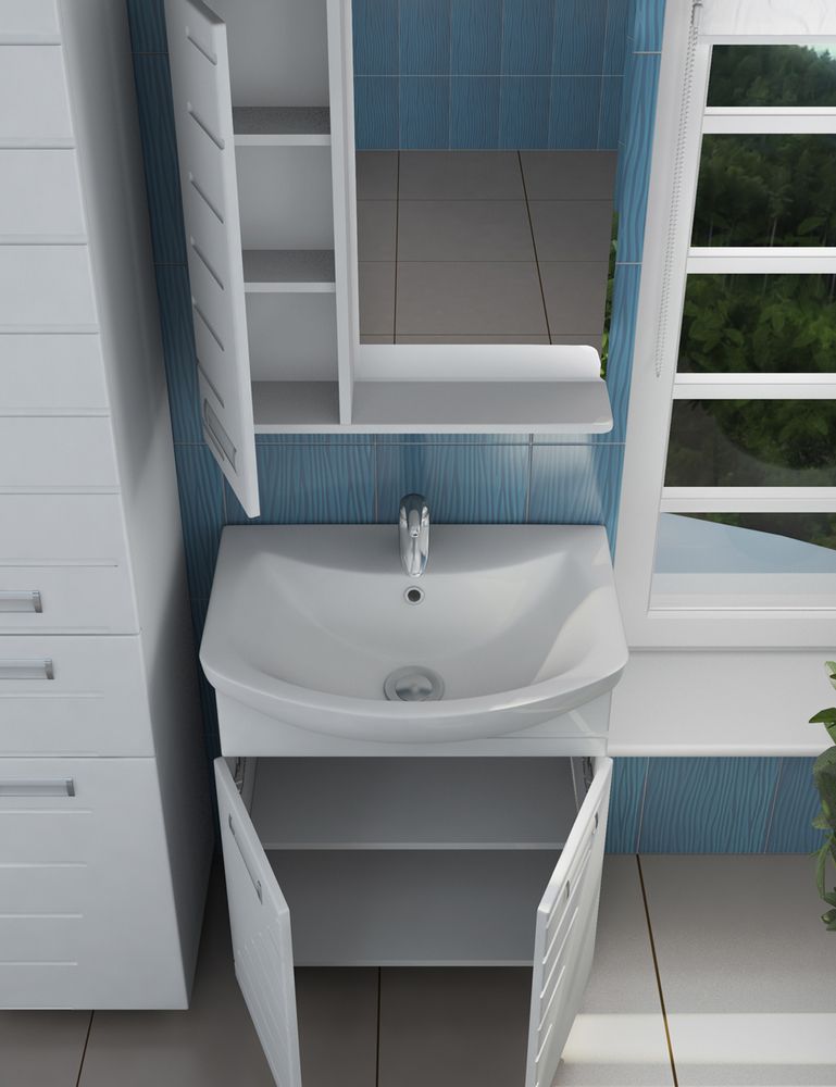 1 дверца; 2 полки ЛДСП, 1 светодиодный светильник, включатель с розеткой; ручка врезная металлическая хромированная.