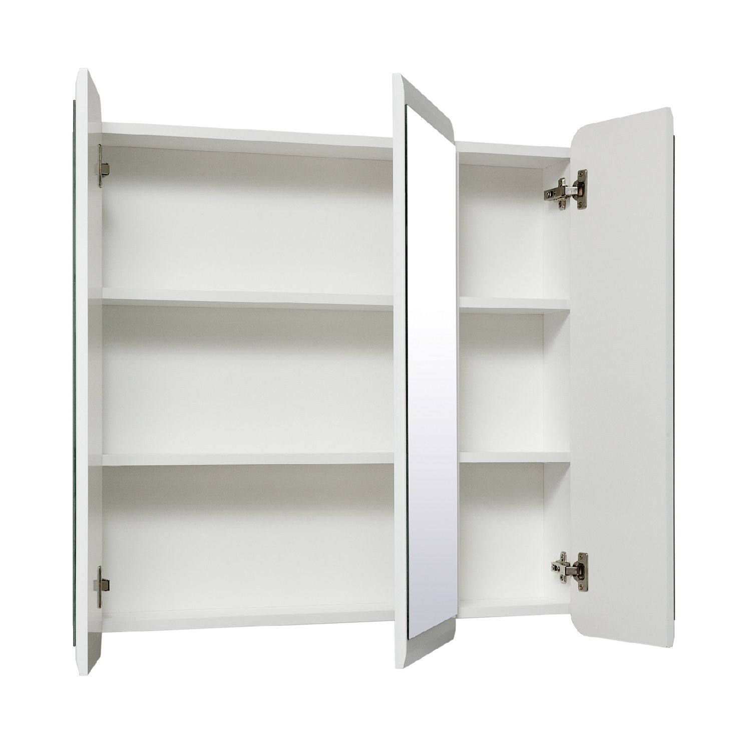 Зеркальный шкаф без подсветки c тремя распашными фасадами. Внутри шкафа - две встроенные полки. Петли со встроенным доводчиком.