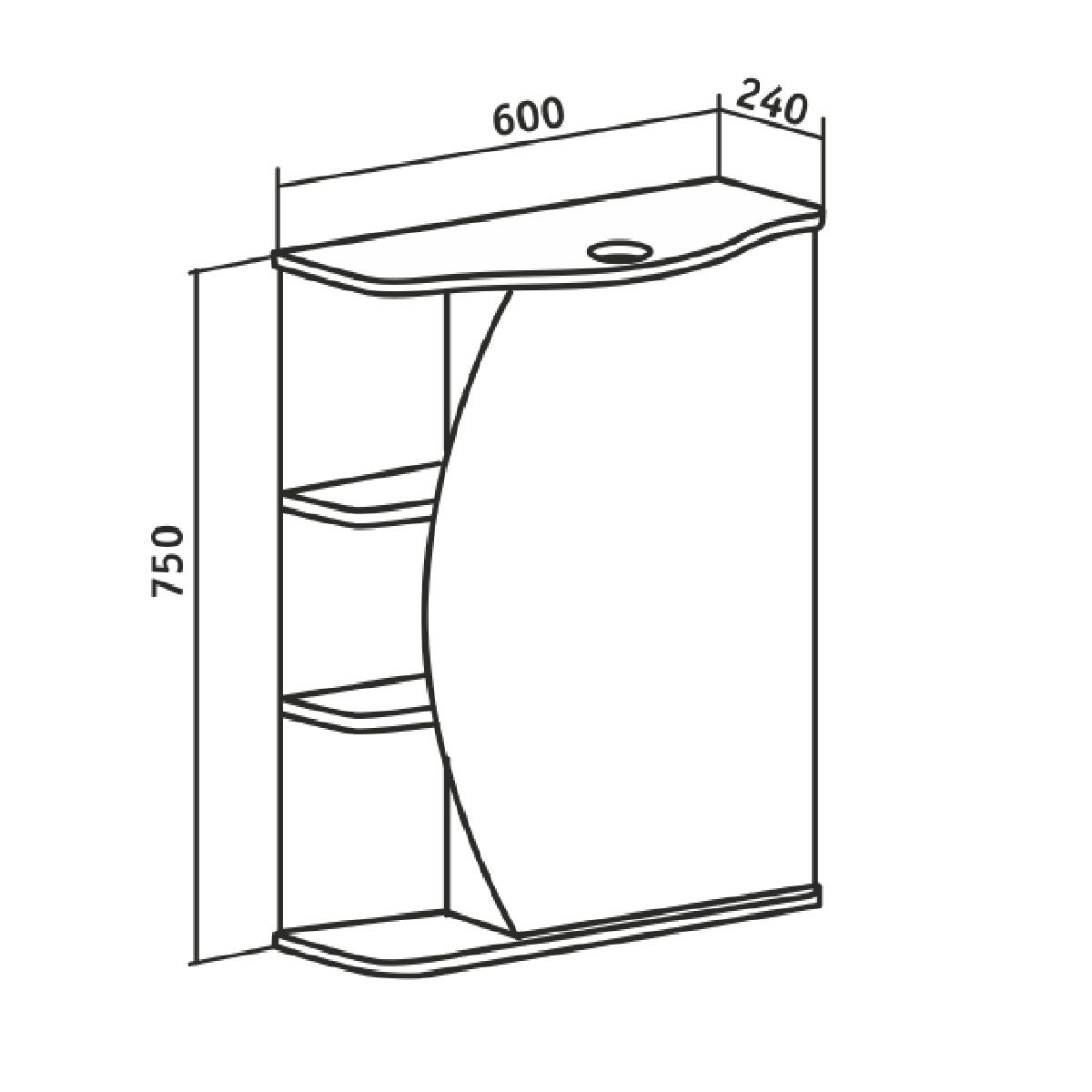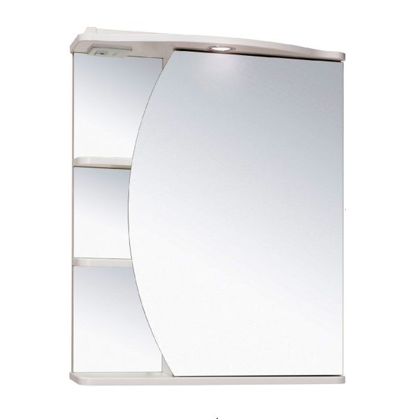 Зеркальный шкаф оборудован одним врезным светодиодным светильником 220В и розеткой с выключателем. Справа - шкаф с фигурной зеркальной дверцей и двумя внутренними полками, слева - две открытые полочки. Петли со встроенным доводчиком.