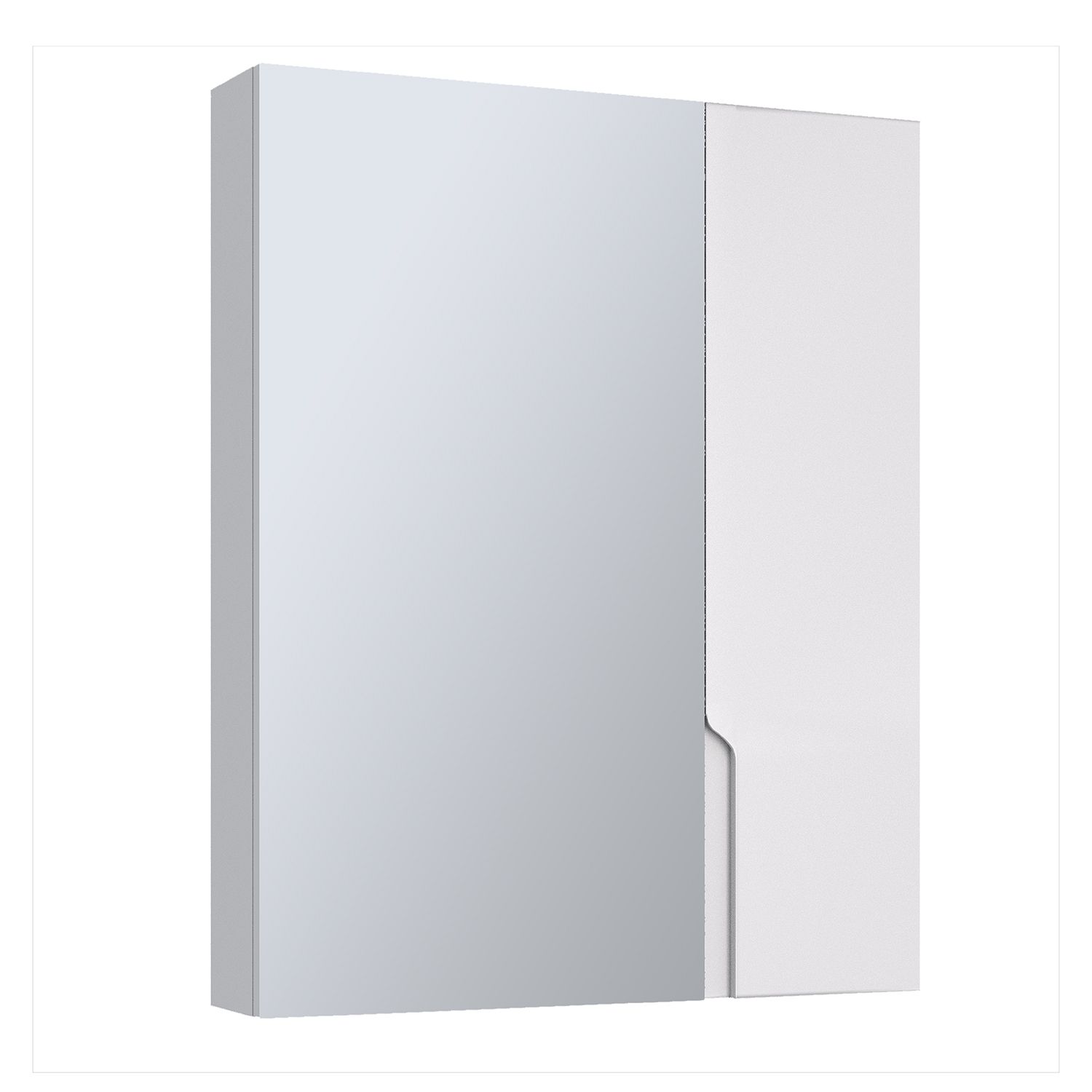 Зеркальный шкаф без подсветки c двумя ассиметричными дверками, одна из которых зеркальная, а вторая - белая. Внутри шкафа - две горизонтальные  полки.  Петли со встроенным доводчиком.