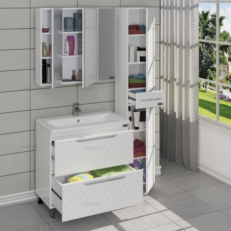 Зеркало-шкаф СанТа не только функциональный предмет интерьера ванной комнаты, но замечательное эргономичное дополнение дизайна, как небольшого, так и крупного помещения.Компания СанТа использует при производстве высококачественные водоотталкивающие материалы (ВЛДСП), соответствующие всем необходимым требованиям безопасности. Серия отличается превосходным дизайном с соблюдением всех значимых элементов современного стиля. Основным цветом, в котором выполнено шкаф-зеркало СанТа является белый, отлично подходящий большинству дизайнерских решений. Шкаф-зеркало предусматривает удобную и вместительную систему хранения, состоящую из полочек.Страной бренда СанТа является Россия, все товары производятся с выполнением соответствующих стандартов качества, что позволяет быть полностью уверенными в долговечности и надежности. Зеркало-шкаф СанТа это абсолютный комфорт в современной ванной комнате.