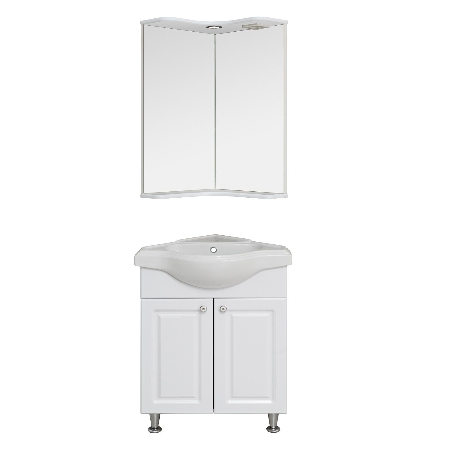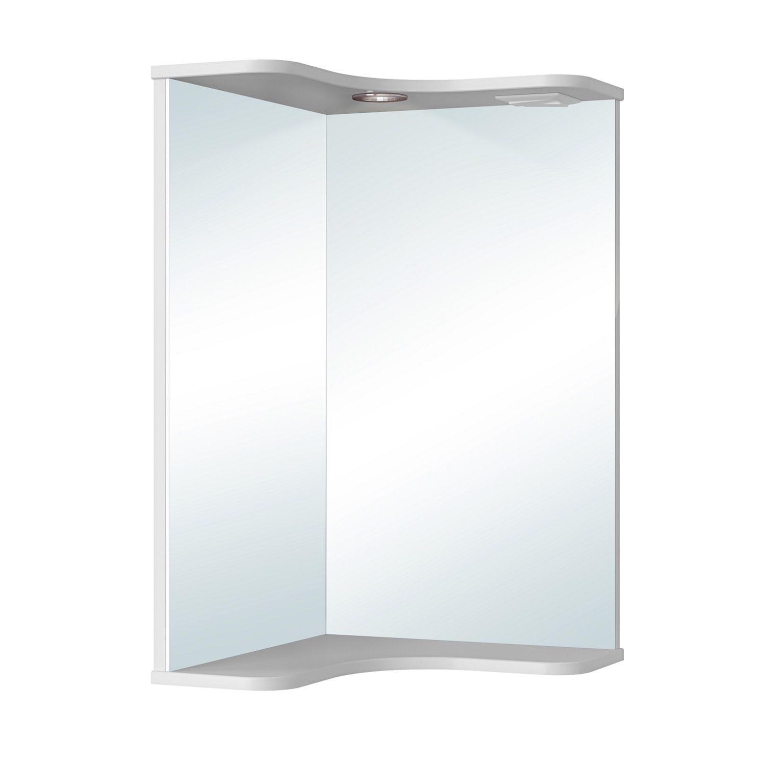 Угловое навесное зеркало с козырьком и нижней полкой. Оборудовано одним врезным светодиодным светильником 220В и розеткой с выключателем.