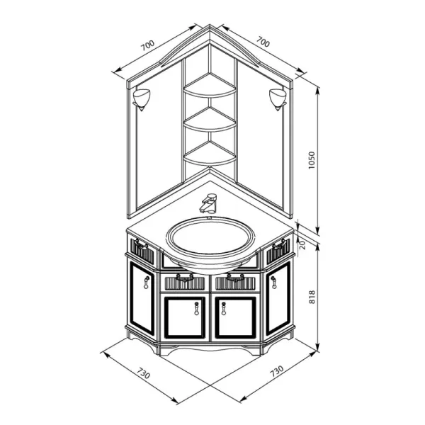 Угловое зеркало для ванной из комплекта мебели Акванет Луис выполнено в том же стиле, что и весь набор. Благодаря угловому расположению, такая модель помогает экономить пространство и эффективно использовать традиционно мало задействованные зоны. Зеркало можно укомплектовать двумя элегантными бра, заказав их дополнительно, и создать тем самым мягкое рассеянное освещение. ВНИМАНИЕ! Светильники в стоимость зеркала не входят. Их необходимо выбрать из числа рекомендованных для этой модели. Представленная на фото модель снята с продажи. Поэтому при заказе зеркала со светильниками отметьте понравившуюся модель в окне выбора, располагающемся под описанием. Для установки светильников на зеркале предусмотрены отверстия. При заказе зеркала без светильников изделие будет выполняться на заказ, и срок его изготовления составит 2-4 недели.